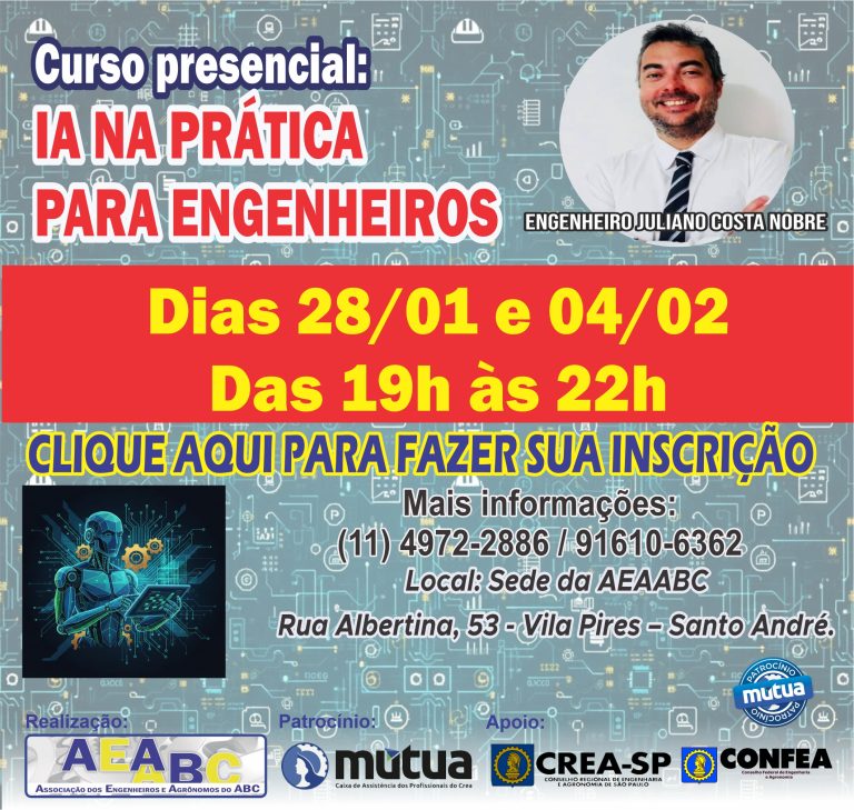 Para participar, basta acessar: https://aeaabc.com.br/curso-presencial-ia-na-pratica-para-engenheiros e realizar a inscrição.